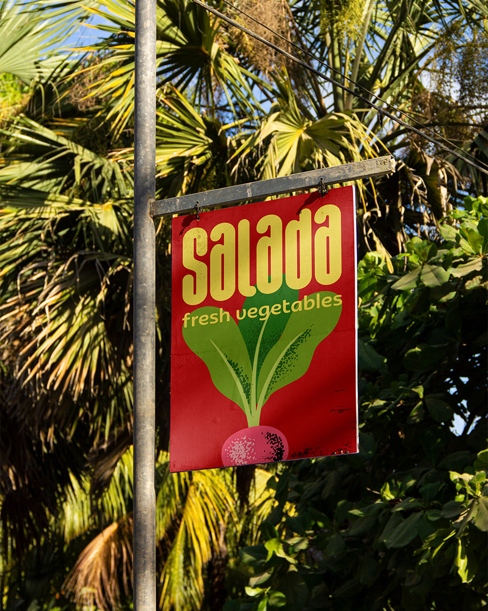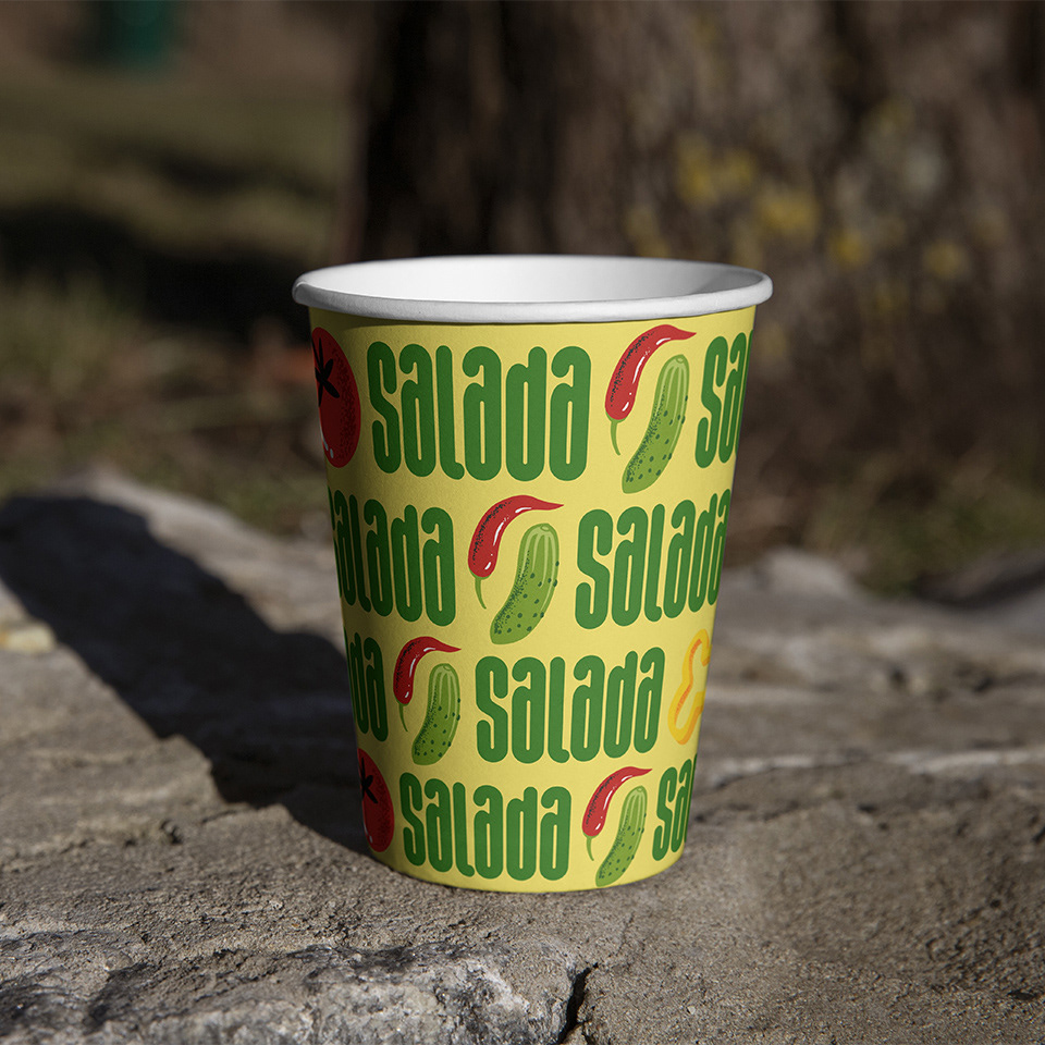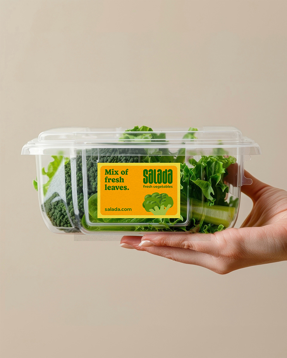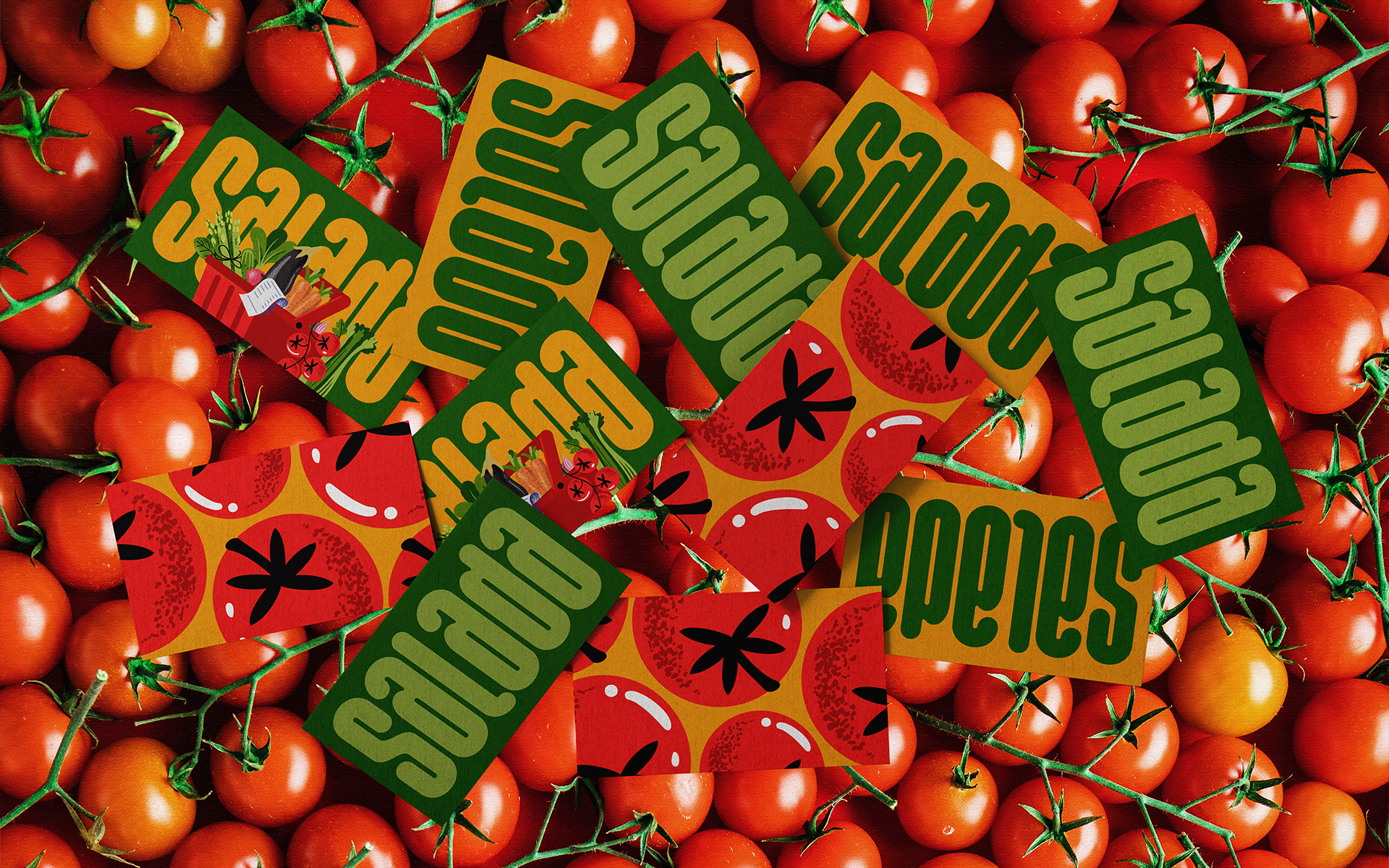 Além disso, a identidade visual da Salada apresenta ilustrações personalizadas que trazem um toque de jovialidade e personalidade à marca. Essas ilustrações, inspiradas em produtos frescos, ajudam a criar uma conexão emocional com os consumidores, reforçando os valores de qualidade e saúde que a marca Salada representa.