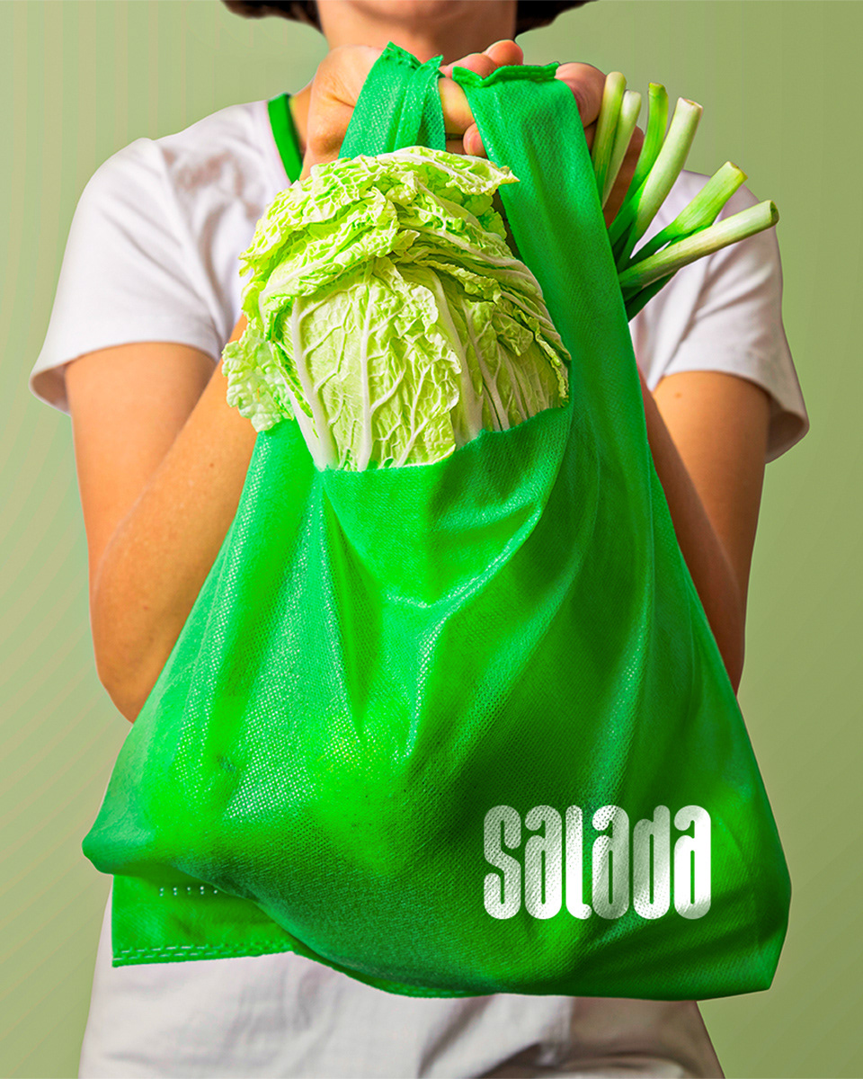 A construção do logotipo segue uma grade consistente que proporciona uma sensação de equilíbrio e harmonia visual. A tipografia moderna e amigável escolhida para o logotipo complementa a identidade visual da Salada, mas também comunica os valores de frescor, saúde e qualidade que a marca representa. Com essa escolha tipográfica, a Salada se posiciona como uma marca acessível e confiável, pronta para conquistar a preferência dos consumidores que buscam produtos frescos e saudáveis.